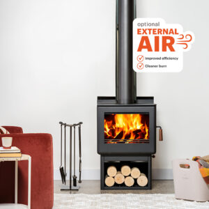 A large firebox with 5 piece log capacity, keeps your fire burning longer with fewer refuels. In-built wood storage makes wood easily accessible and keeps wood dry, ready for cleaner, hotter burning.
